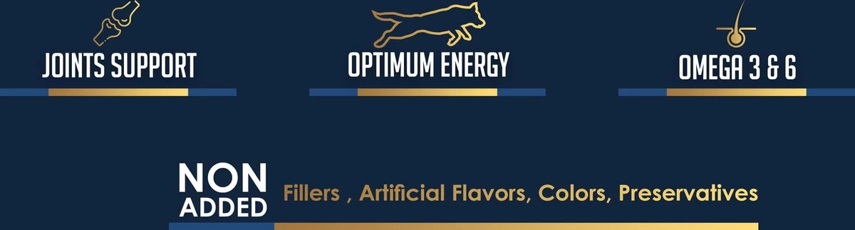 | Voedingswaarde | 28% Gedroogde kip, mais, bruine rijst, gerst, gevogeltevet, gedroogde bietenpulp, gedroogde vis, lijnzaad, eipoeder, zalmolie, biergist, gedroogde johannesbroodpeulen, glucosamine, chondroitine, vitamines en mineralen.<br /><br />Eiwitbron: 83% Dierlijke eiwitten en 17% plantaardige eiwitten. |