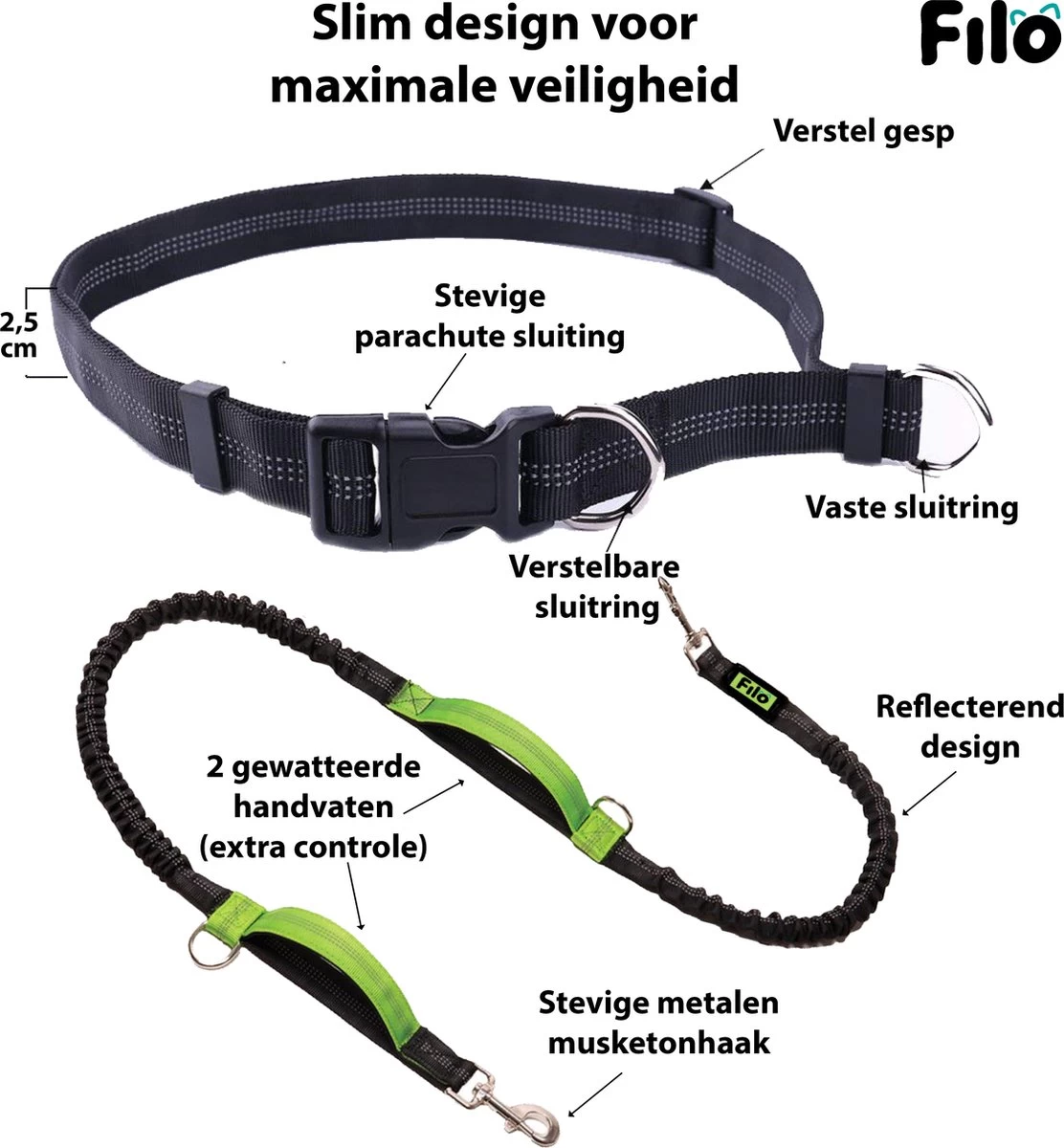 Zoek niet verder naar andere hondenriemen, deze Filo Harloopriem biedt de oplossing voor ontspannen rennen en wandelen met je hond (middelgroot tot 30kg). Door de heupriem met twee elastische schokabsorberende delen in de looplijn wordt bewegen met je hond een feestje voor jullie beide. De hondenriem is gemakkelijk verstelbaar en vast te klikken aan de halsband van je hond. Door de verstelbare sluitring op de heupriem houd jij gemakkelijk je handen vrij tijdens het bewegen. De sterke stiksels, metalen musketonhaken en het reflecterende design zorgen voor veiligheid en een geschikte trainingslijn binnen de honden riemen. De heuptas van premium materiaal is van handig formaat met opbergruimte voor alle belangrijke artikelen.