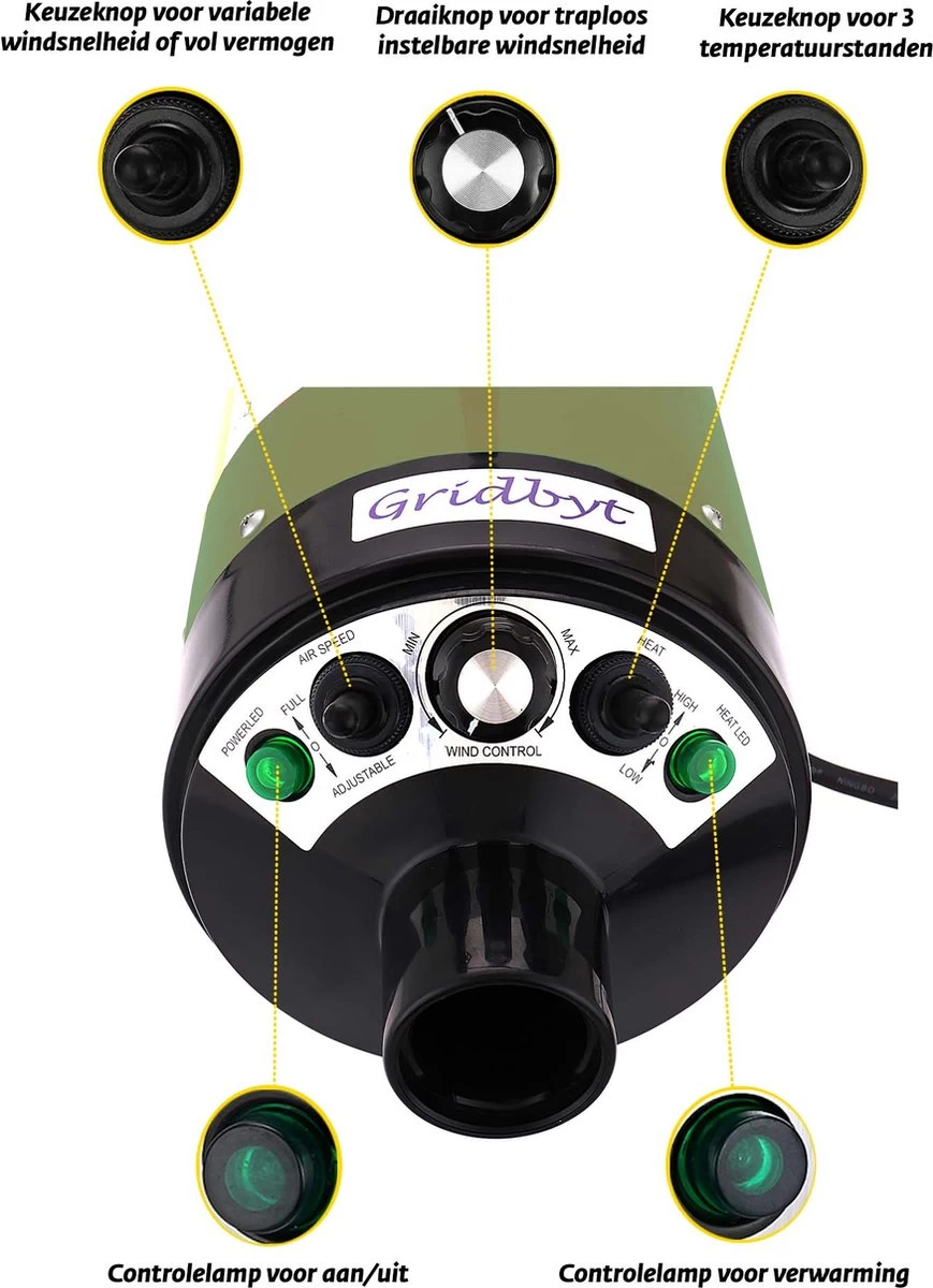 De professionele hondenföhn en waterblazer van Gridbyt. Deze hoogwaardige föhn is ‘de’ föhn voor de vacht van uw hond. Heeft de hond even een duik in het water gemaakt, of is hij helemaal nat van de regen? Met deze föhn blaast u hem gemakkelijk weer droog en schoon. Doordat de luchtsnelheid van deze krachtige föhn traploos ingesteld kan worden, kunt u met iedere gewenste snelheid de hond droog blazen. Ook is de temperatuur van de lucht instelbaar in stappen van 30℃ tot 70℃ , zodat het voor de hond een aangenaam gevoel is. Als er vuil in de vacht zit wordt dit ook zonder moeite weggeblazen. Er zullen dus na het droogblazen geen klitten en vuil meer aanwezig zijn in de vacht.