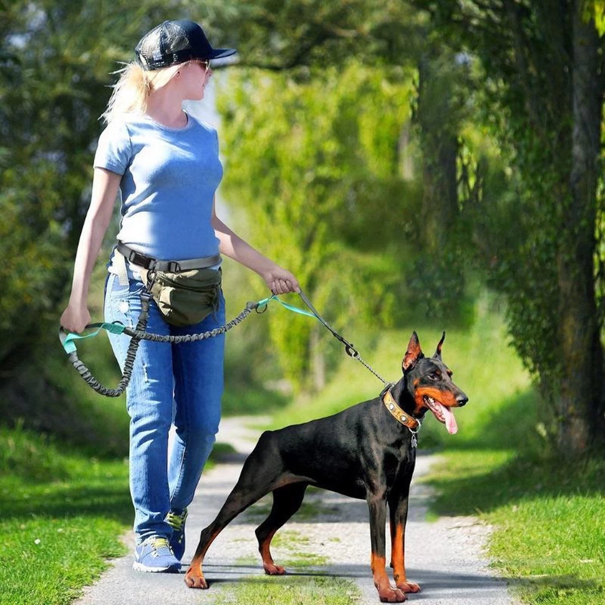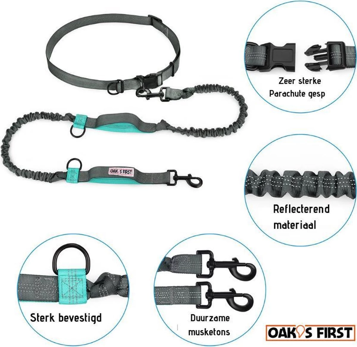 Deze set bestaat uit een riem met een lijn die je aan de halsband van jouw hond vastklikt. Zo blijft jouw hond altijd in de buurt en heb je toch je handen vrij. De lijn zit bovendien met een haak met kogelgewricht vast om te voorkomen dat de lijn in de knoop raakt en er zijn twee schokdempers in de riem. Deze zorgen ervoor dat er flexibiliteit en comfort is tijdens het uitlaten. De set is voorzien van reflecterende stiksels, zo ben je zelfs in het donker ook goed zichtbaar. Het is heel eenvoudig om de heupriem af te stellen op de juiste maat.