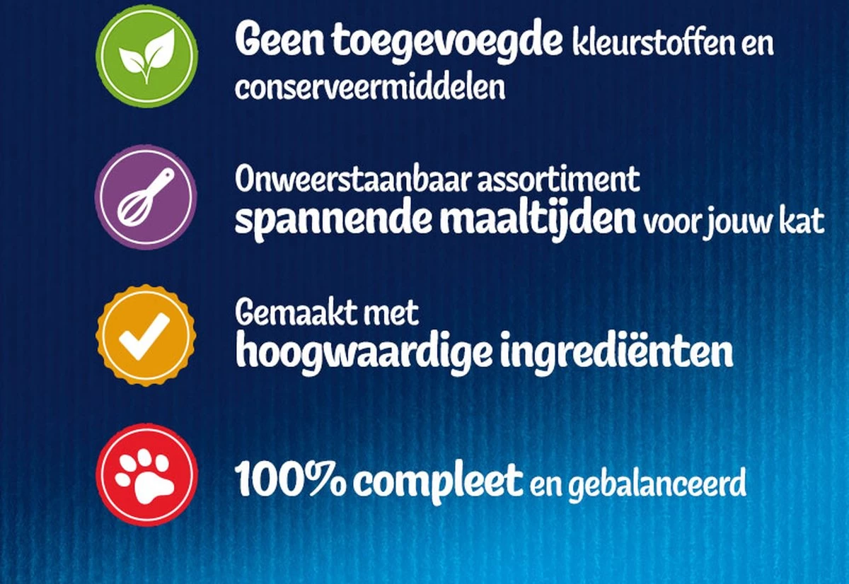 FELIX Elke Dag Feest is een assortiment onweerstaanbare maaltijden die er zó lekker uitzien, zó lekker ruiken en zó lekker smaken alsof je het zelf hebt klaargemaakt! Speciaal bereid met zachte stukjes in een overheerlijke gelei. Jouw deugniet zal elke keer weer genieten van een onweerstaanbare maaltijd. Deze heerlijke maaltijden vormen ook een bron van essentiële omega 6-vetzuren met de juiste combinatie van uitgebalanceerde vitaminen die jouw kat energie zullen geven en klaar zullen maken om nog meer kattenkwaad uit te halen. Ze zitten vol gezonde ingrediënten om 100% te voldoen aan de behoeften van jouw kat indien gevoed volgens de voedingsrichtlijnen op de verpakking.